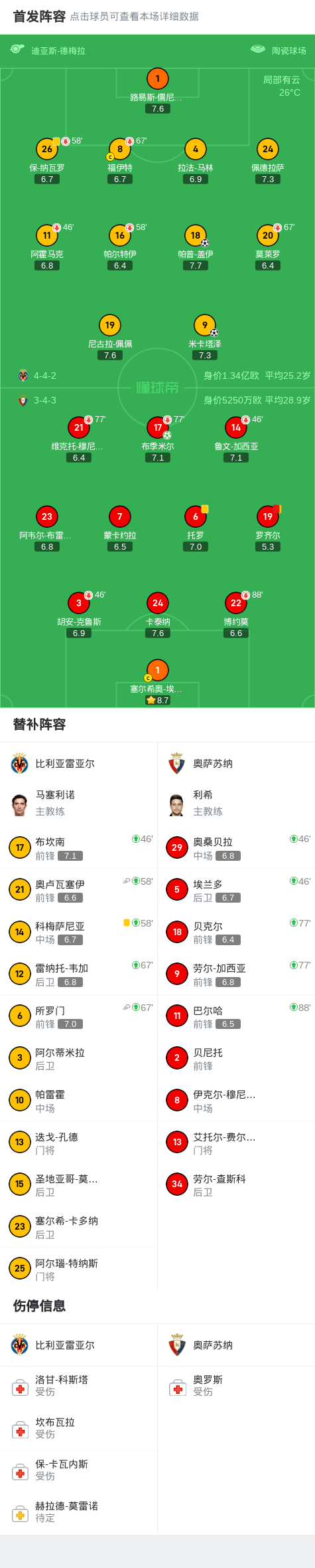 比利亚雷亚尔2-1十人奥萨苏纳,米卡塔泽建功,帕普-盖伊制胜