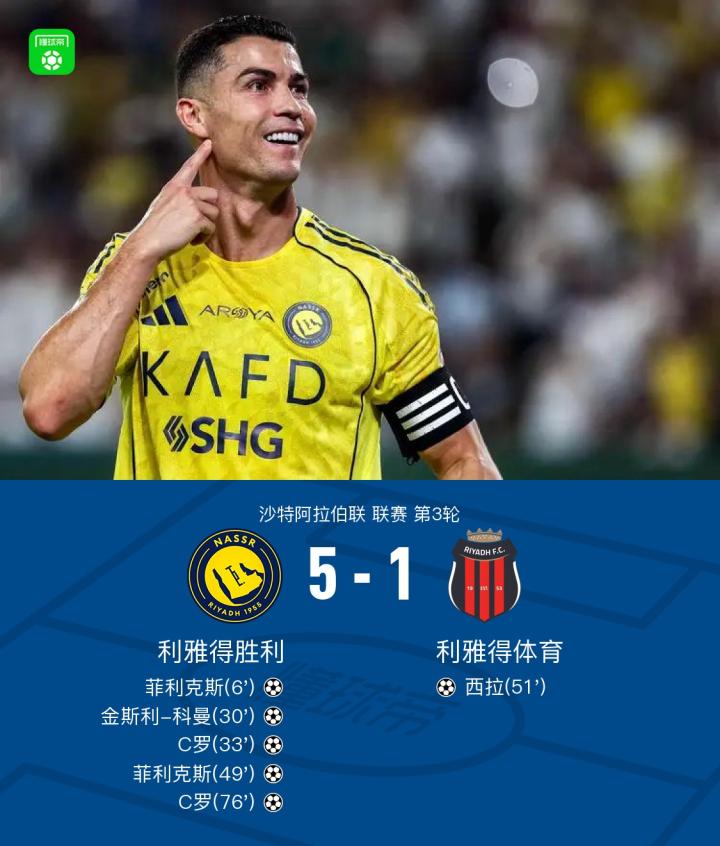 利雅得胜利5-1利雅得体育,C罗、菲利克斯双响,科曼破门