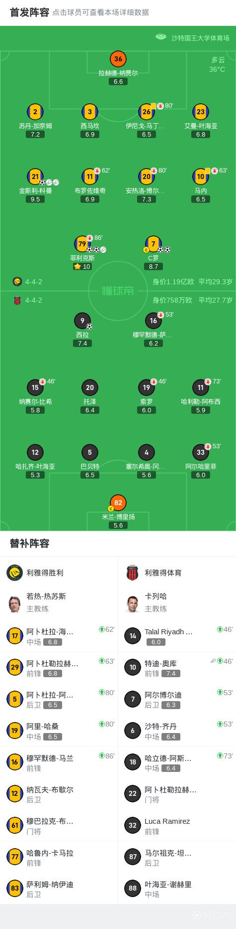 第52分钟,西拉禁区头球破门,利雅得胜利4-1利雅得体育