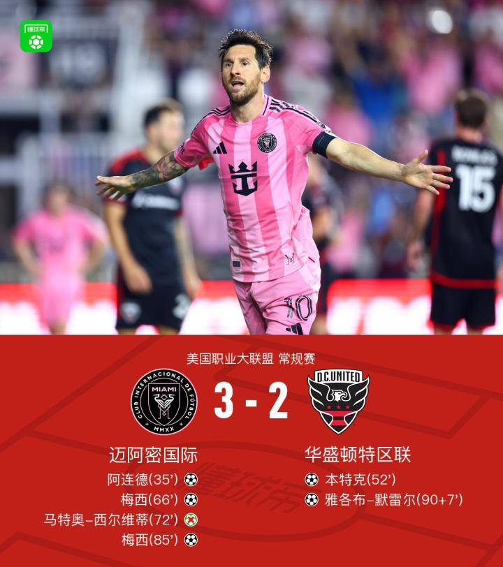 迈阿密国际3-2华盛顿特区联,梅西双响+助攻,西尔维蒂失点