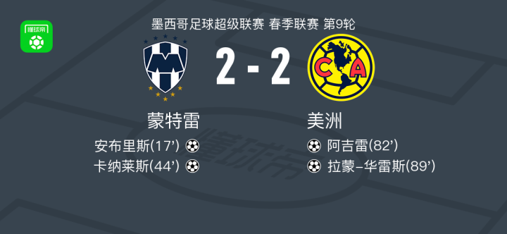 北京时间9月21日墨西哥足球超级联赛 春季联赛 第9轮,蒙特雷主场对阵美洲。蒙特雷安布里斯破门,卡纳莱斯破门。美洲阿吉雷破门,拉蒙-华雷斯破门。最终比分蒙特雷 2-2 美洲。