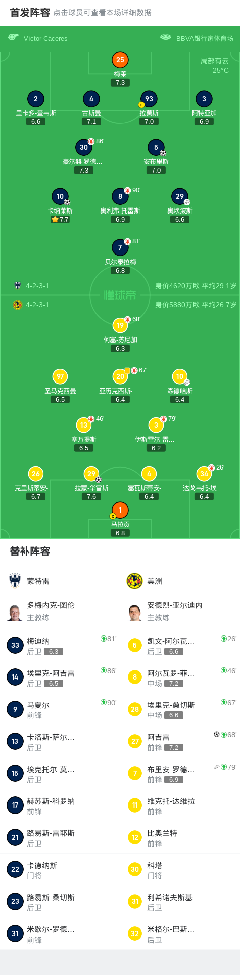 蒙特雷2-2美洲,安布里斯先拔头筹,拉蒙-华雷斯扳平