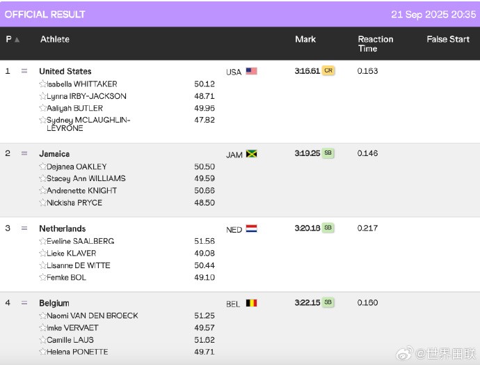 女子4x400米接力:美国队3分16秒61打破赛会纪录,收获冠军gaoniu @懂球帝2025-09-21 19:439月21日,2025年东京田径世锦赛女子4x400米接力决赛,美国队一路领先,镇守第四棒的麦克劳林再次跑出48秒以内的分段(47.82),最终3分16秒61打破赛会纪录,以超过2秒的优势轻松夺冠。牙买加3分19秒25创赛季最佳获得银牌,荷兰3分20秒18同样创赛季最佳获得铜牌。展开更多