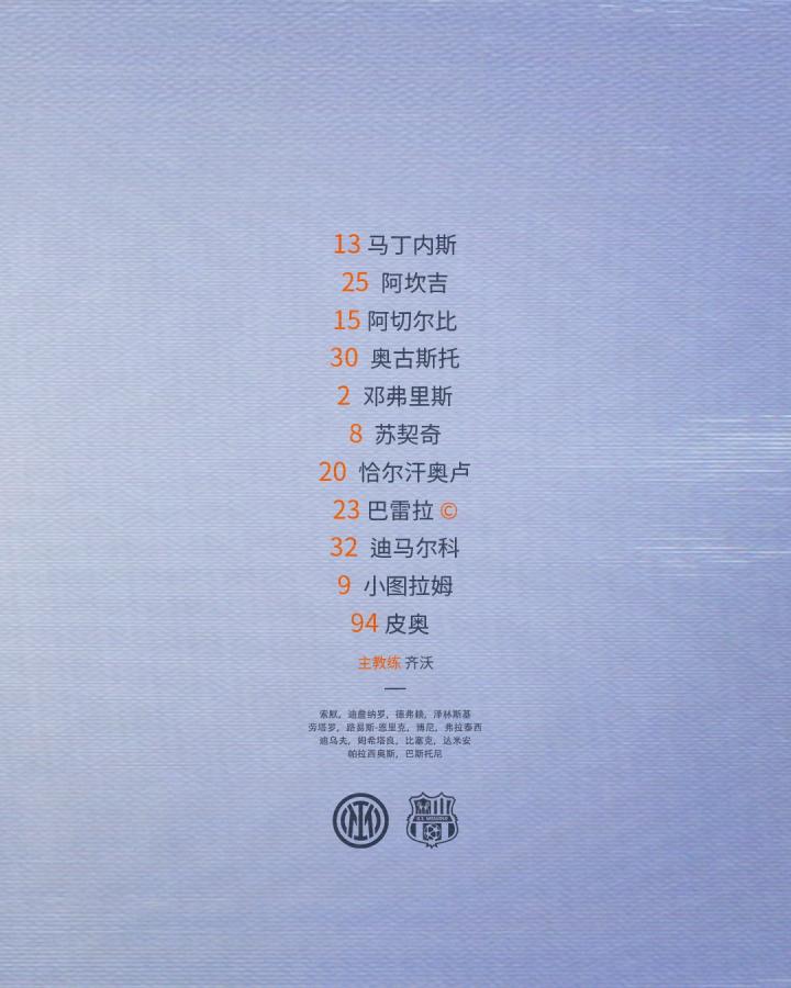 替补:1-索默、12-迪詹纳罗、6-德弗赖、7-泽林斯基、10-劳塔罗-马丁内斯、11-路易斯-恩里克、14-博尼、16-弗拉泰西、17-安迪-迪乌夫、22-姆希塔良、31-比塞克、36-达米安、42-托马斯-帕拉西奥斯、95-巴斯托尼