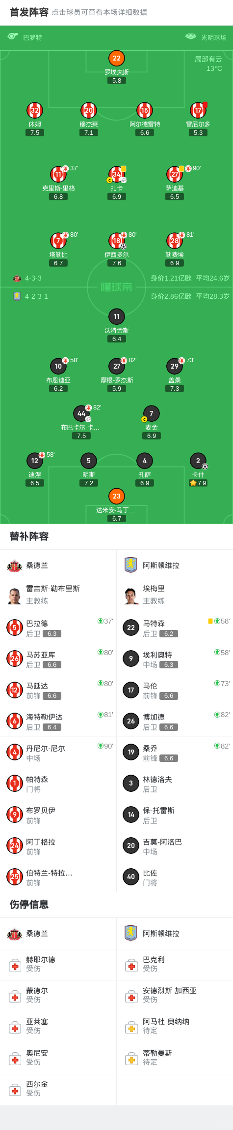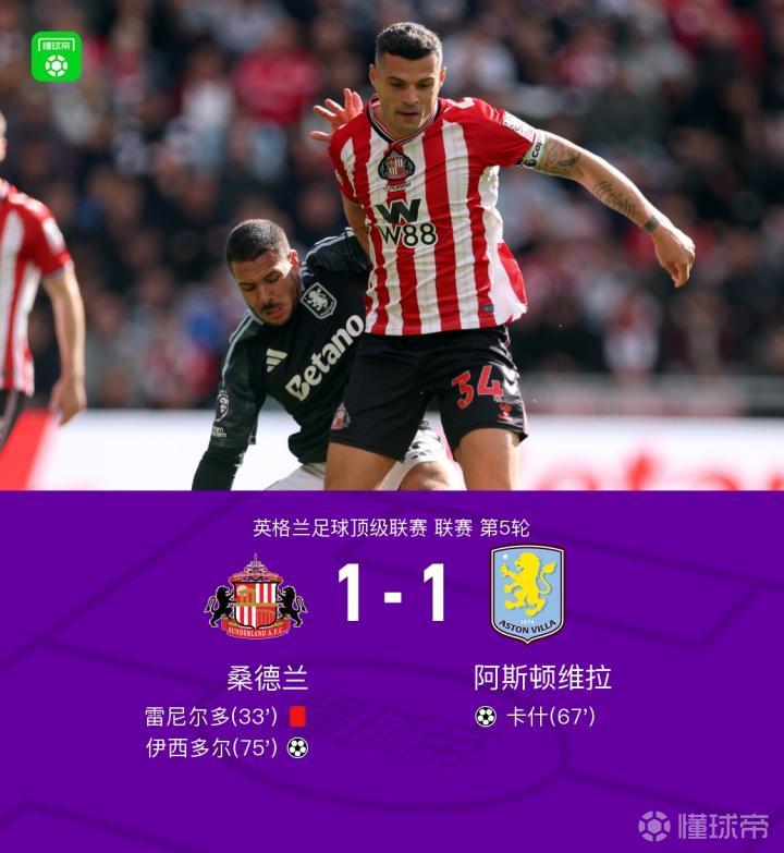 十人桑德兰1-1战平维拉,卡什、伊西多尔建功,雷尼尔多染红