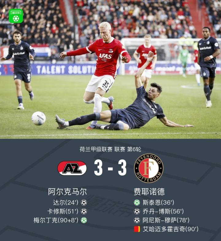 阿尔克马尔3-3费耶诺德,达尔先拔头筹,梅尔丁克扳平