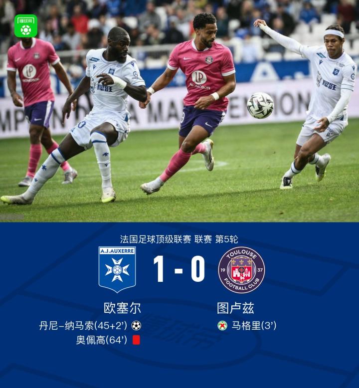 北京时间9月21日,法国足球甲级联赛第5轮展开较量,欧塞尔坐镇主场迎战图卢兹。比赛伊始,图卢兹获得点球机会,但未能成功转化为进球。上半场补时阶段,西纳约科送出精准助攻,丹尼-纳马索冷静破门,为欧塞尔取得领先。易边再战,欧塞尔在防守端承受压力,奥佩高因犯规被直接红牌罚下,球队陷入人数劣势。尽管少打一人,欧塞尔顽强守住胜果,最终以1-0战胜图卢兹,全取三分。