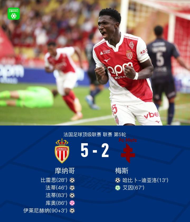 摩纳哥5-2梅斯,法蒂替补梅开二度,比雷斯、伊莱尼赫纳建功