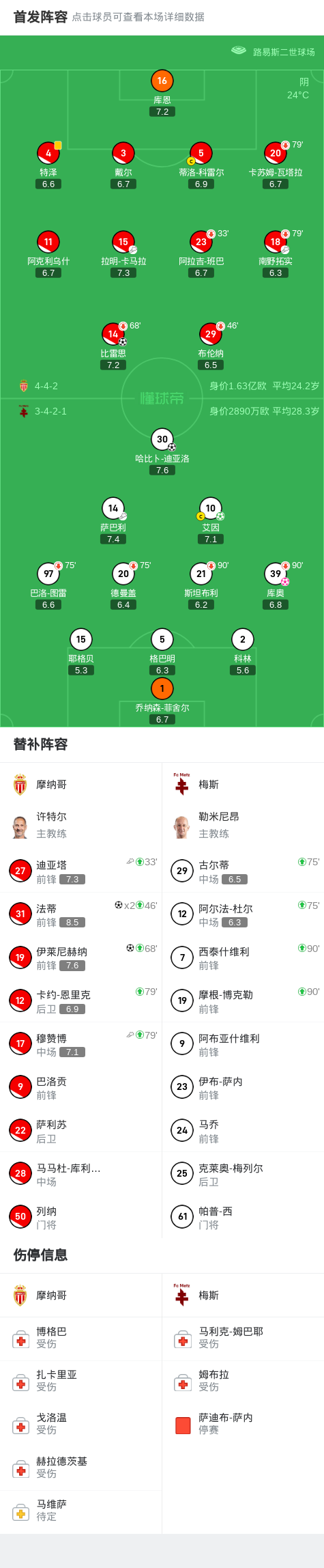 第46分钟,替补建功,法蒂门前推射破门逆转比分,摩纳哥2-1