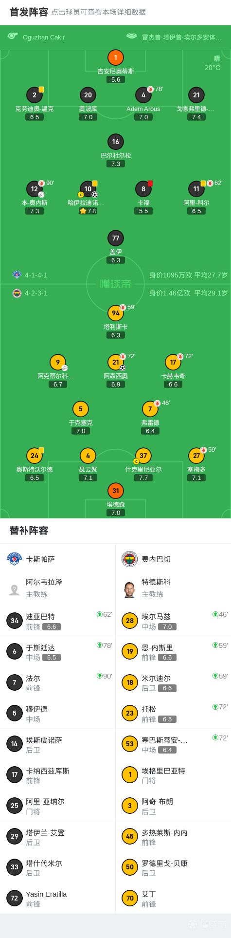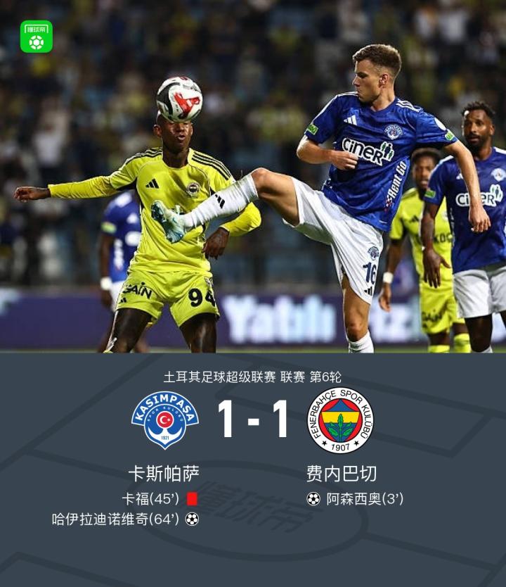 北京时间9月22日土耳其足球超级联赛 联赛 第6轮,卡斯帕萨主场对阵费内巴切。卡斯帕萨哈伊拉迪诺维奇破门。费内巴切阿森西奥破门。最终比分卡斯帕萨 1-1 费内巴切。