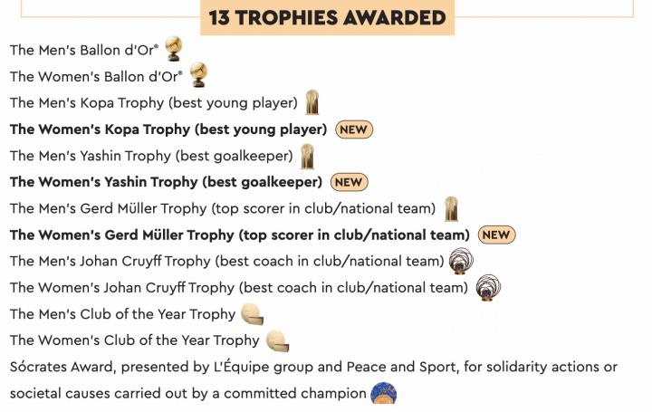 参与男足金球奖和女足金球奖评选的记者,还将对应投票评选出男女足的雅辛奖、克鲁伊夫奖和最佳俱乐部奖。科帕奖的评审团则由前金球奖得主组成。