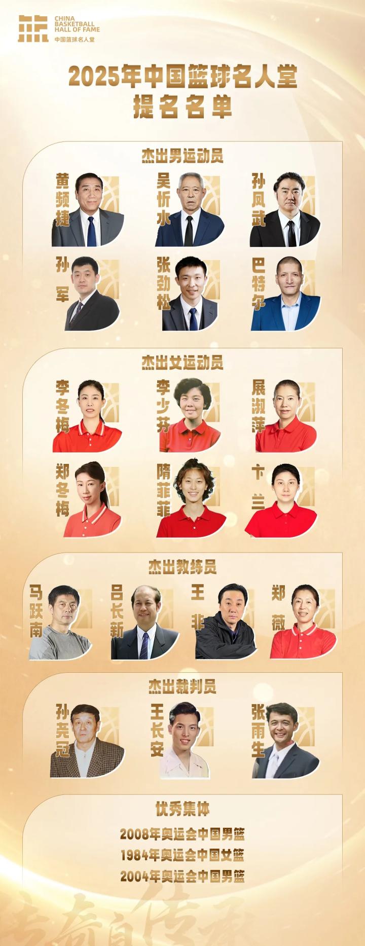 篮协公示2025年名人堂提名:巴特尔、孙军领衔,08奥运男篮在列