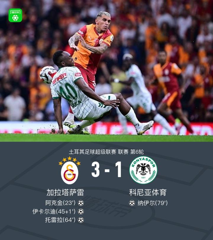 北京时间9月23日,土耳其足球超级联赛第6轮展开角逐,加拉塔萨雷坐镇主场迎战科尼亚体育。比赛中,加拉塔萨雷率先打破僵局,阿克金攻入一球,为球队取得领先。随后,阿克金送出助攻,伊卡尔迪接球后冷静施射得手,进一步扩大比分。下半场,罗兰-绍洛伊精准传球助托雷拉破门,将优势延续。科尼亚体育并未放弃,纳伊尔在队友配合下扳回一城。最终,加拉塔萨雷以3比1战胜科尼亚体育,全取三分。