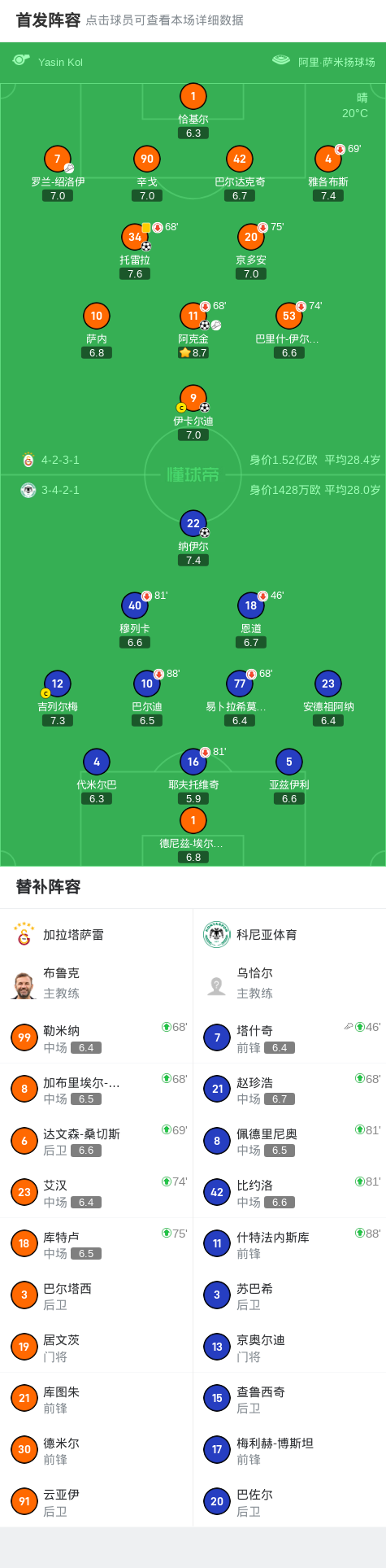 第23分钟,伊尔马兹射门被挡出,阿克金补射建功,加拉塔萨雷1-0