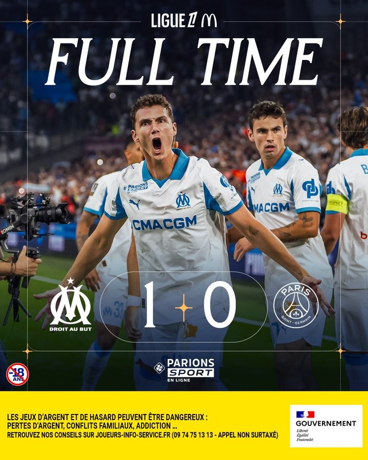 终结联赛对巴黎7连败,马赛近14年首次法甲主场击败巴黎