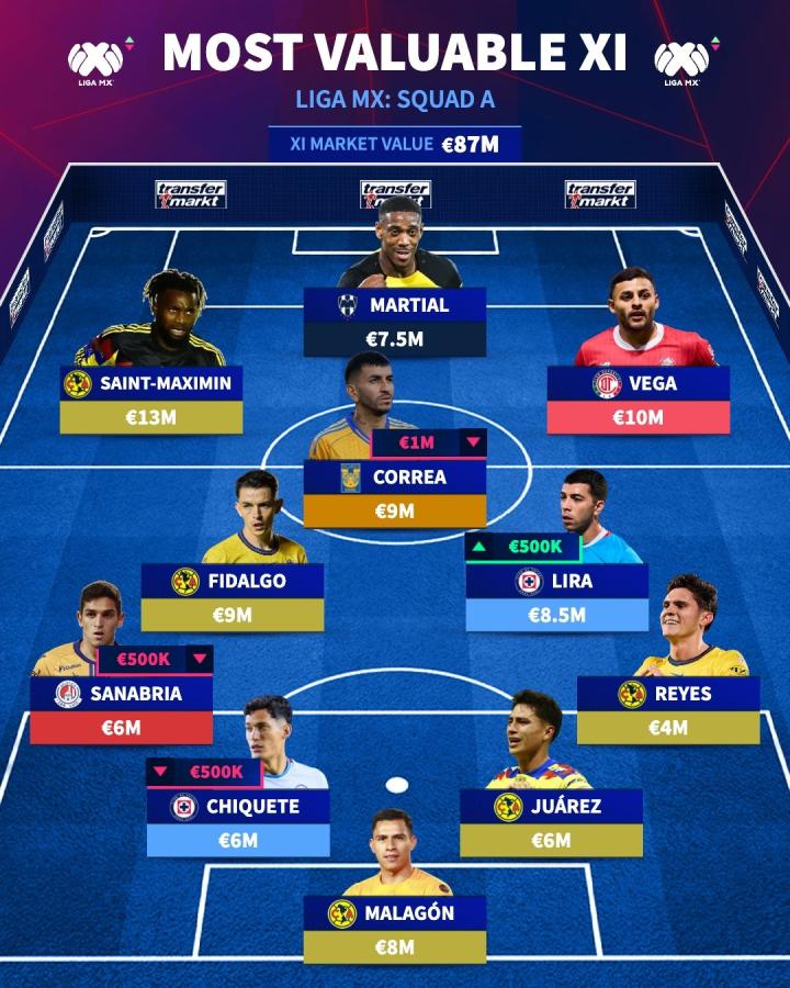 北京时间9月23日,德国转会市场列出了墨西哥超级联赛的身价最高阵容,其中马夏尔、圣马克西曼、安赫尔-科雷亚在列。
