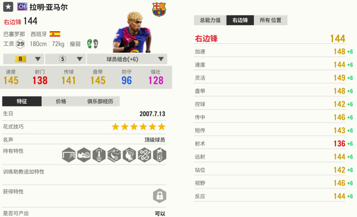 亚马尔在2025年相继推出高OVR赛季卡,今天要推荐的是CH,是平民玩家能用到的最好亚马尔。他拥有惊人的盘带、敏捷和平衡性,手感极佳,球粘在脚上,变向频率快。亚马尔内切后的搓射很有威胁,他的射术精湛,左脚能画出美妙的弧线来。