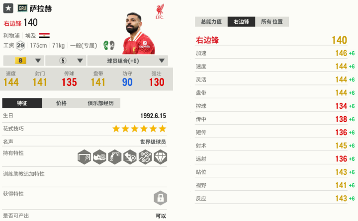 萨拉赫堪称“黄金左脚”,无论是禁区内的大力抽射、巧射,还是禁区线上的搓射,命中率都极高。GRU萨拉赫虽然不如25TS,但是比起一般的边锋,他也能把握住大多数机会。而且萨拉赫非常强壮、平衡好,在高速带球和对抗中不易摔倒,能很好地护住球。