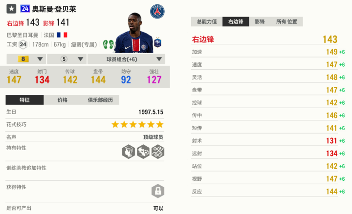 登贝莱的版本不多,这里推荐24U赛季。众所周知,速度与盘带是登贝莱的立身之本,24U也不例外。这张卡的爆发力、绝对速度和灵活性都是顶级的,能成为绝对的主力边路爆点。