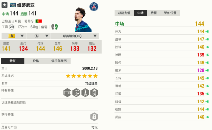 维蒂尼亚最强赛季是25TS,这张卡有顶级的传球数据(视野、短传、长传),可以利用这一优势,通过传球调度撕扯防线,给队友制造空间。维蒂尼亚还有很好的护球能力,面对压迫也能从容摆脱,进而完成向前的推进。他的手感极佳,这点和哈维很像。