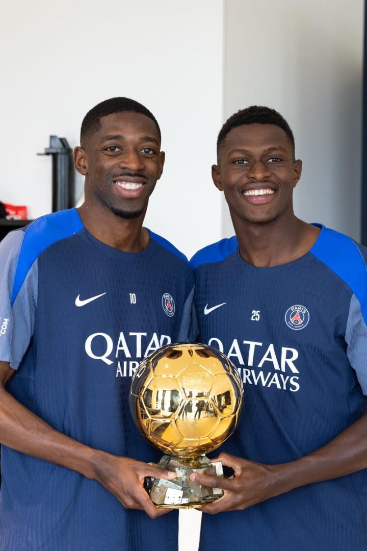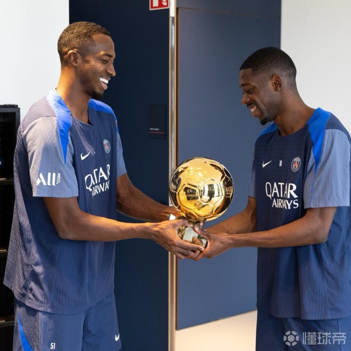 当地时间9月23日,登贝莱携金球奖返回巴黎训练基地,与全队分享荣誉。