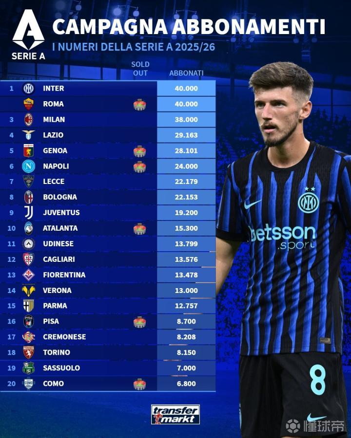 转会市场网统计了2025/26赛季意甲联赛各队季票销售情况,其中国际米兰和罗马以40000张并列排在第一位。
