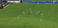 第90+4分钟,纽约城球员禁区内接球后外脚背射门,球击中门框
