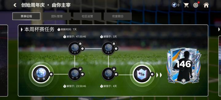 本周杯赛任务,玩家参与总计五场比赛,完成后可以获得一枚创始交换代币,使用该代币可以参与146能力值创始周年庆球员的特惠交换,折扣一张143球员卡。