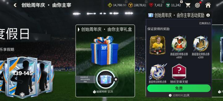 登录游戏可以免费领取创始周年庆礼盒,获得141能力值三国球员萨比策,800点高级进阶转移点券在内的丰富奖励。