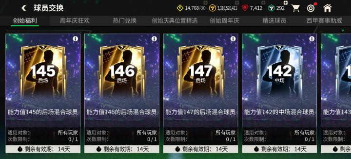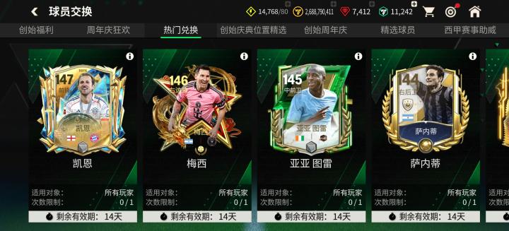 本周更新后,球员交换部分迎来了142能力值金色麦穗佩蒂特、143能力值赛季最佳萨利巴、144能力值传奇圣殿萨内蒂、145能力值创始周年庆亚亚图雷、146能力值赛季最佳终极梅西、147能力值赛季最佳终极凯恩,六项定向交换。