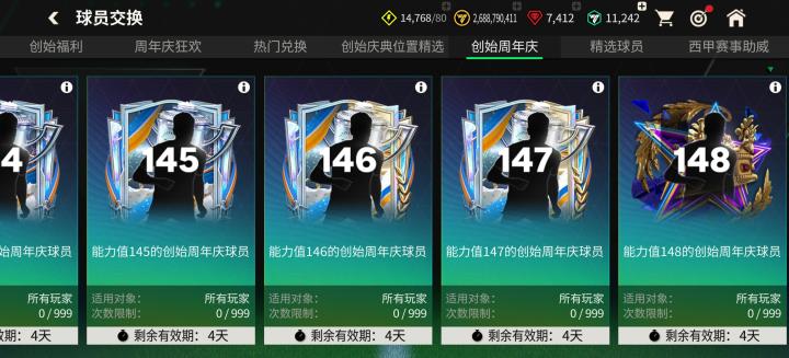 创始周年庆活动球员基础能力值为139-149,其中,149能力值的全新球员吉尔伯托·席尔瓦可通过定向交换方式获取,其余的139-148能力值创始周年庆球员可通过对应能力值卡池交换获取。148能力值贝尔、卢西奥、维埃拉;147能力值梅西、马拉多纳、C罗等热门球员值得关注。