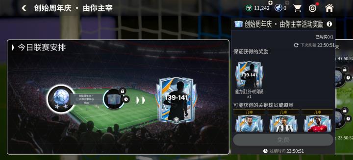 今日联赛安排,玩家完成后可以领取一张139-141能力值创始周年庆球员卡。