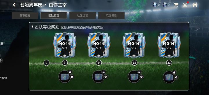 玩家的团队等级总计提升达到对应级别,可以解锁领取团队等级奖励,最高总计提升21级团队等级,可以获得8名140-141能力值创始周年庆球员卡奖励。