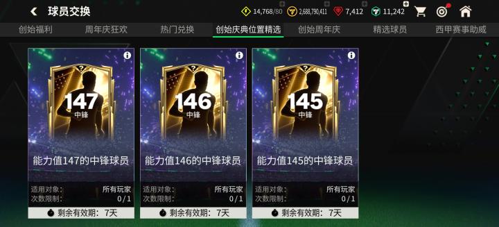 领取球员置换币后,可以前往球员交换界面参与142-147能力值球员置换,玩家可以选择参与前场、中场、后场三组位置的142-147球员卡,每个能力值限参与1次。