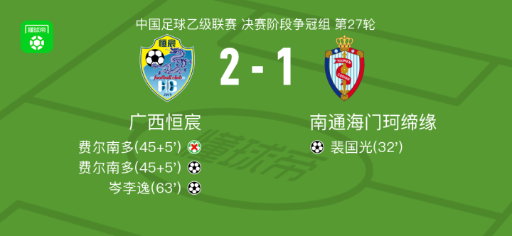 北京时间9月26日中国足球乙级联赛 决赛阶段争冠组 第27轮,广西恒宸主场对阵南通海门珂缔缘。广西恒宸费尔南多破门,岑李逸破门。南通海门珂缔缘裴国光破门。最终比分广西恒宸 2-1 海门珂缔缘。