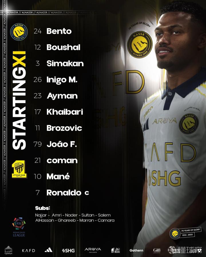 利雅得胜利首发:24-本托、12-纳瓦夫-布歇尔、3-西马坎、26-伊尼戈-马丁内斯、23-艾曼-叶海亚、17-阿卜杜拉-海巴里、11-布罗佐维奇、79-菲利克斯、21-金斯利-科曼、10-马内、7-C罗