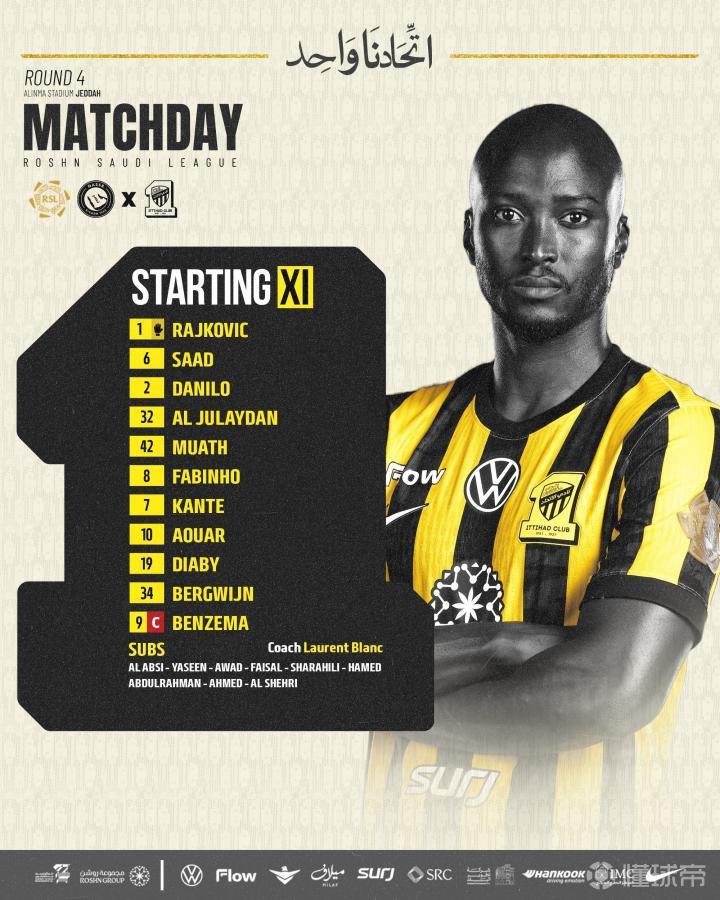 吉达联合首发:1-拉伊科维奇、6-萨阿德-穆萨、2-达尼洛-佩雷拉、32-艾哈迈德-朱莱丹、42-穆阿特-法克希、8-法比尼奥、7-坎特、10-奥亚尔、19-穆萨-迪亚比、34-贝尔温、9-本泽马