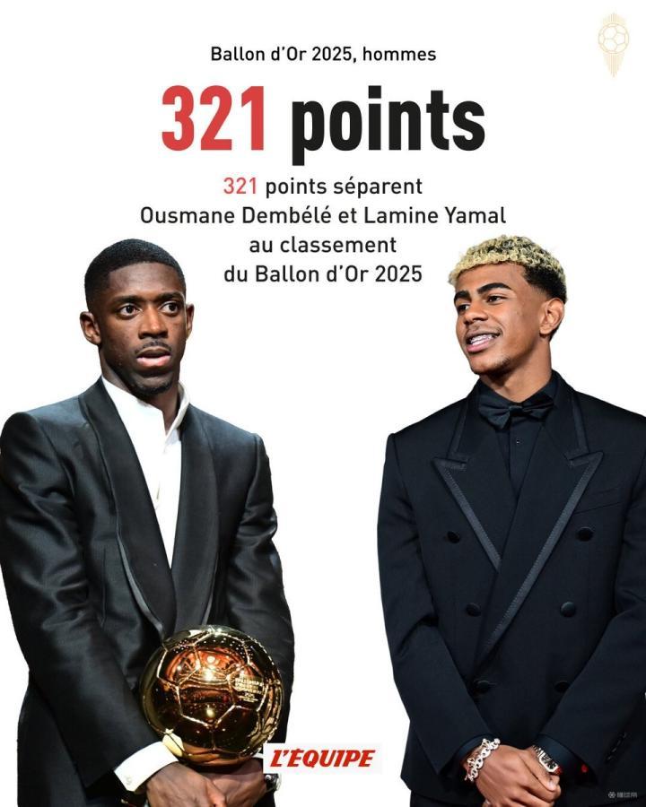 与2024年罗德里(曼城)以微弱优势击败维尼修斯(皇家马德里)不同——当时两人仅相差41分——这位巴黎圣日耳曼前锋在本次评选中以显著的优势击败了他的主要对手亚马尔。事实上,这位法国球员比西班牙国脚多出321分。