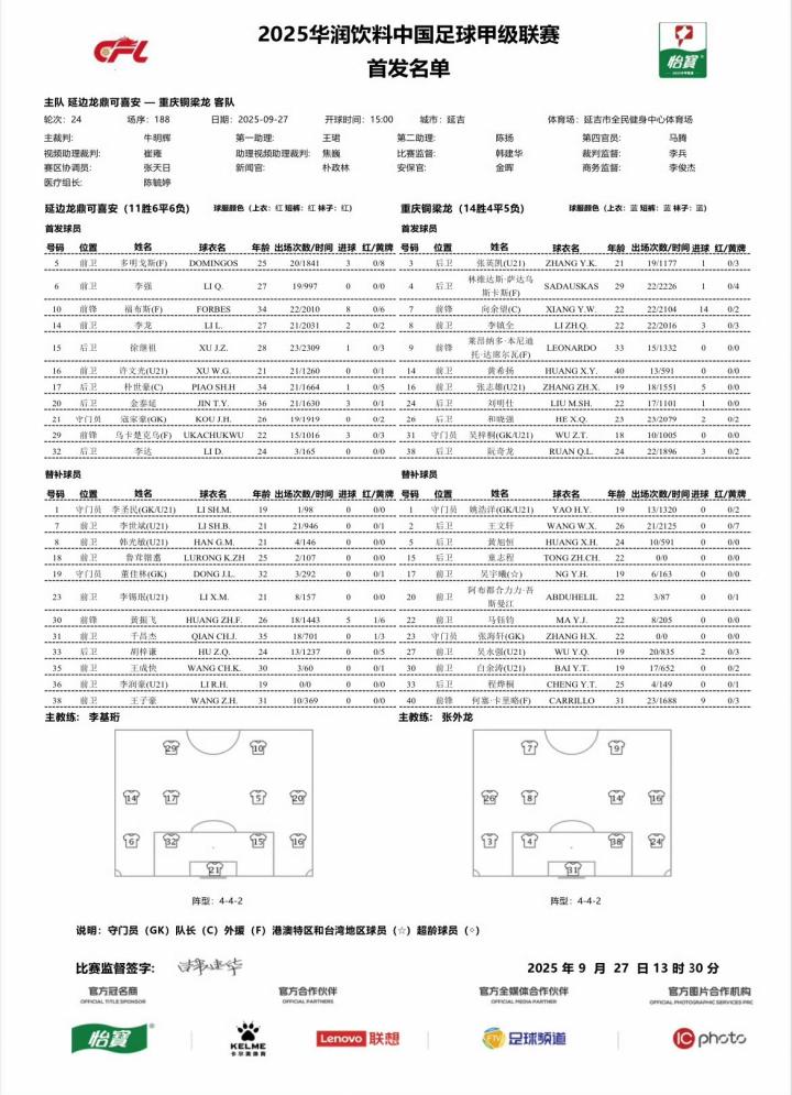 北京时间9月27日,中甲第24轮,延边龙鼎主场对阵重庆铜梁龙。赛前首发公布。