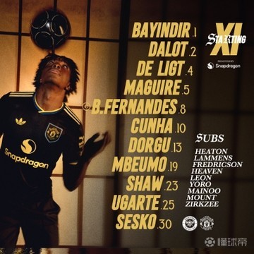 曼联首发:1-巴因迪尔、4-德利赫特、5-马奎尔、23-卢克-肖、13-多古、8-布鲁诺-费尔南德斯、25-乌加特、2-达洛特、10-库尼亚、19-姆伯莫、30-谢什科