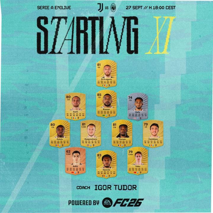 尤文图斯首发:16-迪格雷戈里奥、3-布雷默、4-加蒂、6-凯利、15-卡卢卢、19-图拉姆、8-库普梅纳斯、27-坎比亚索、17-阿季奇、20-奥蓬达、10-伊尔迪兹
