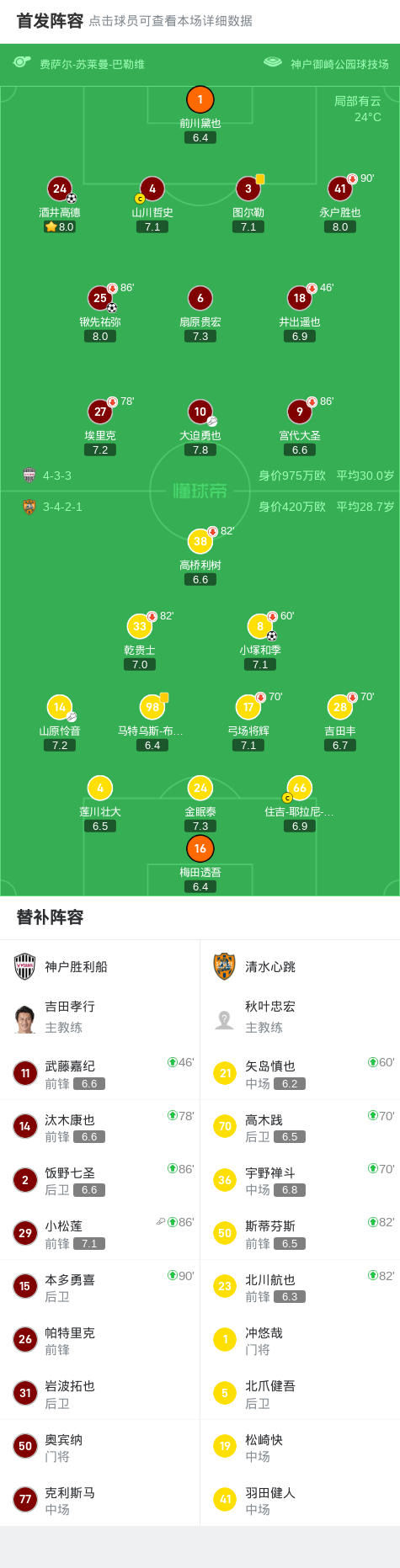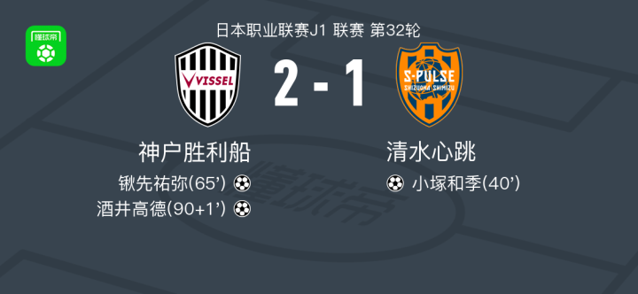 北京时间9月27日日本职业联赛J1 联赛 第32轮,神户胜利船主场对阵清水心跳。神户胜利船锹先祐弥破门,酒井高德破门。清水心跳小塚和季破门。最终比分神户胜利船 2-1 清水心跳。