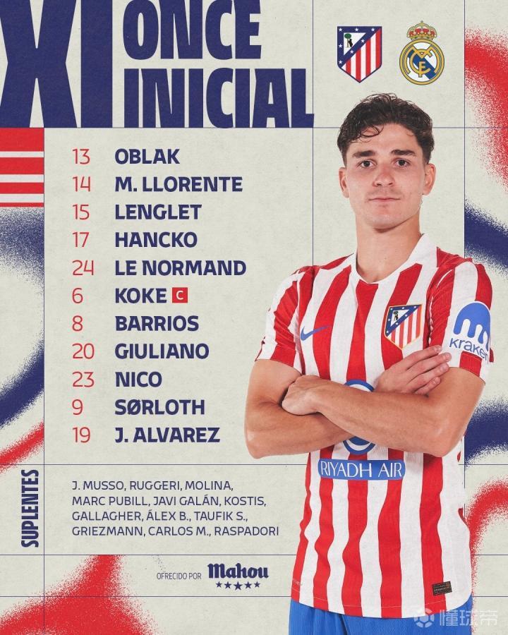 北京时间9月27日22点15分,西甲第7轮马竞坐镇主场迎战皇马,双方赛前公布首发名单。