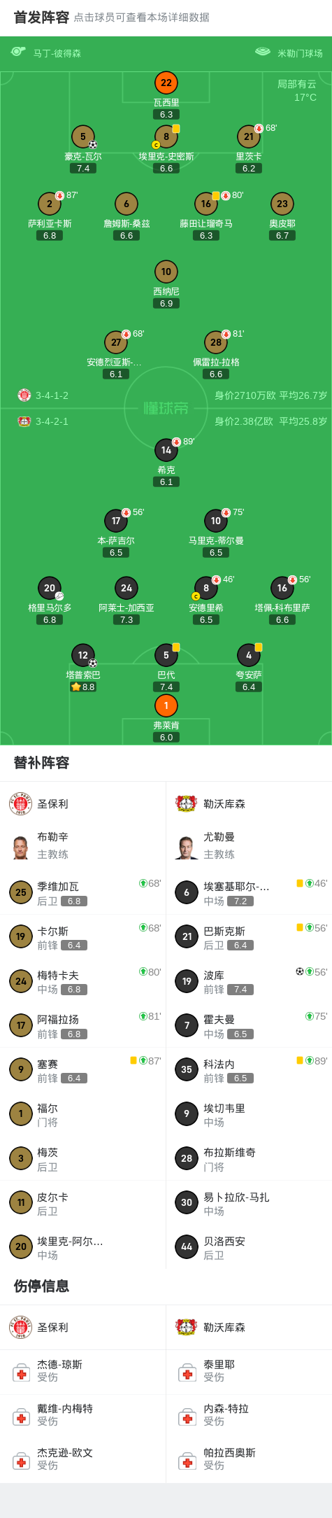 第33分钟,豪克-瓦尔门前侧钩补射破门扳平比分,圣保利1-1勒沃库森