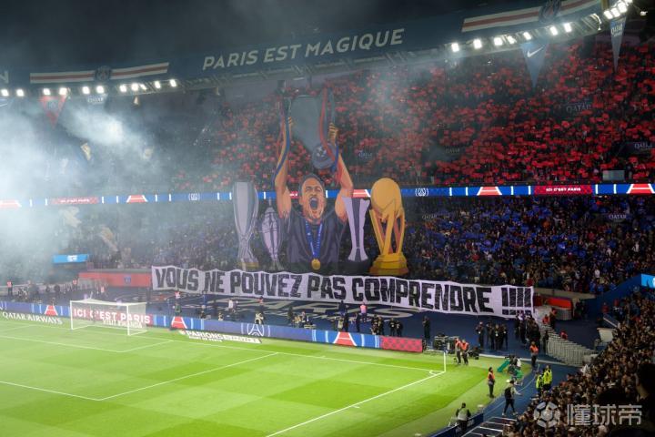 另一个TIFO则是献给功勋主教练恩里克,在TIFO当中恩里克高举着欧冠奖杯,此外他的身边还有他今年率队应得的法甲、法国杯、法国超级杯和欧洲超级杯等冠军奖杯。