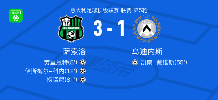 北京时间9月28日,意甲联赛第5轮展开角逐,萨索洛坐镇主场迎战乌迪内斯。比赛伊始,贝拉尔迪送出精准助攻,劳里恩特冷静破门,为萨索洛取得领先。随后不久,劳里恩特在前场完成抢断并迅速策动进攻,助攻伊斯梅尔-科内再下一城,进一步扩大比分优势。下半场,凯南-戴维斯抓住机会为乌迪内斯扳回一球,一度点燃反扑希望。然而萨索洛并未松懈,法代拉在边路送出关键传球,扬诺尼门前果断施射得手,帮助球队锁定胜局。最终全场比赛结束,萨索洛以3比1战胜乌迪内斯。
