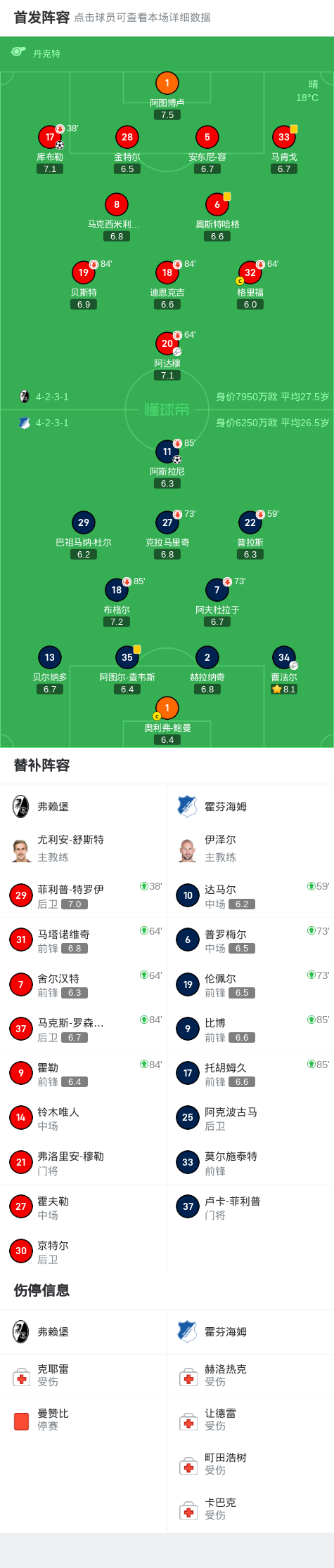 弗赖堡1-1霍芬海姆,库布勒先拔头筹,阿斯拉尼扳平比分