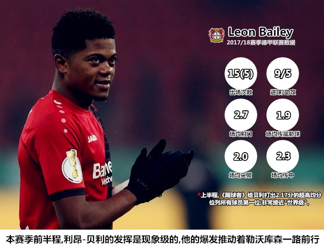 如连珠炮一般的精彩个人秀让利昂-贝利声名日隆,其不拘一格的球路和两边都能打的特点让列强后卫防不胜防。从赛季初徘徊在积分榜末段的问题球队,到冬歇期后跻身积分榜前列的欧冠门票争夺者,利昂-贝利堪称勒沃库森强势反弹过程中的首功之臣。在《踢球者》杂志的本赛季德甲球员打分中,利昂-贝利高居榜首,他的评分(2.11)甚至远远高于第二名的金斯利-科曼(2.63),只要不在后半赛季中出现大幅度滑坡,牙买加新星很可能会在第一个完整的德甲赛季中就斩获联赛MVP的荣誉。