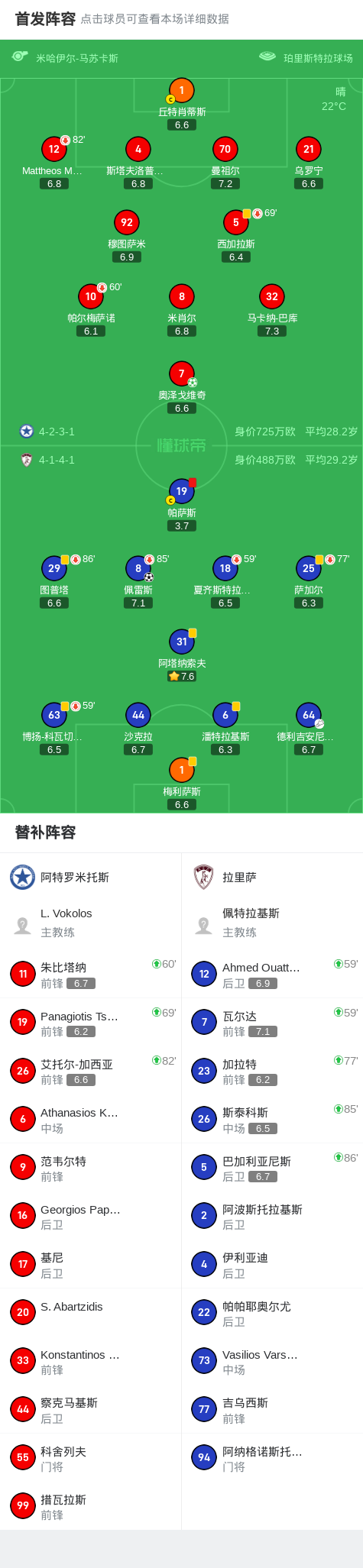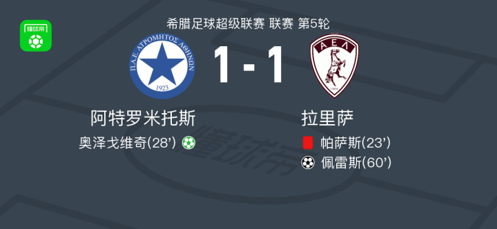 北京时间9月29日希腊足球超级联赛 联赛 第5轮,阿特罗米托斯主场对阵拉里萨。阿特罗米托斯奥泽戈维奇破门。拉里萨佩雷斯破门。最终比分阿特罗米托斯 1-1 拉里萨。