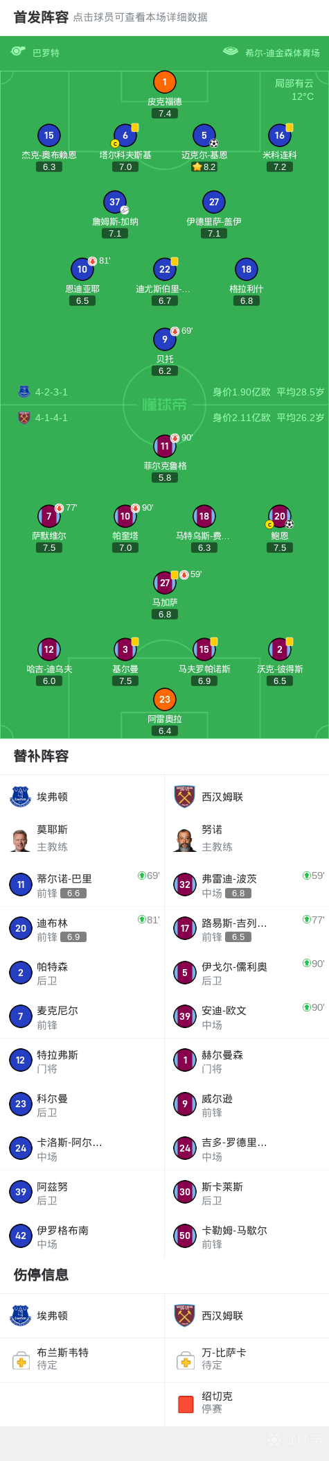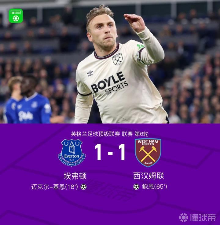 第65分钟,鲍恩禁区右路兜射远角破门,埃弗顿1-1西汉姆联